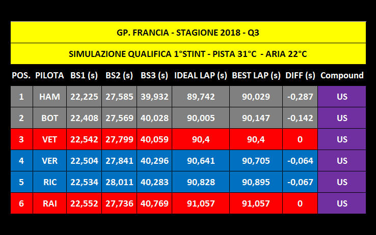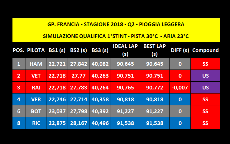Il Q2 di queste qualifiche è stato senza dubbio il momento più interessante del sabato francese. Oltre alla leggera pioggia che ha reso scivoloso il tracciato i top team hanno differenziato le scelte dei pneumatici che verranno utilizzati durante il primo stint della gara. La Ferrari ha scelto su entrambi i piloti la gomma Ultra Soft mentre Mercedes e Red Bull hanno preferito qualificarsi con le Super Soft.  Nonostante l’utilizzo delle gomme Super Soft, Hamilton, è stato il pilota più veloce anche in Q2 e questo già lasciava intendere che il cinque volte campione del mondo inglese sarebbe stato il reale favorito per la pole position.