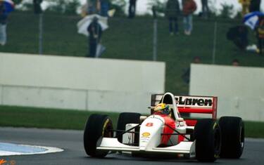 È la stessa pioggia che lo ha aiutato in Brasile. In partenza però Senna perde subito una posizione ed è quinto. Passato anche da Karl Wendlinger sulla Sauber che ha fatto pattinare meno le gomme al via. Ayrton passa però subito Schumacher all’interno e affianca Wendlinger per passarlo all’esterno. All’esterno su una pista allagata in una manovra folle per tutti ma non per lui. Ma non è finita: davanti ci sono le odiate Williams. Alla curva Coppice Senna tiene l’interno, vicino ai cordoli e supera anche Damon Hill e la sua computerizzatissima Fw15C. Ora tra lui e la testa della corsa 15 metri più avanti c’è solo Prost che però, sul bagnato, non è mai stato un fulmine. Ayrton vola letteralmente mentre Michael Andretti, suo compagno in McLaren finisce nella ghiaia dando la conferma che non è la MP4-8 ad essere imprendibile sul bagnato, è proprio Senna ad essere di un’altra categoria.