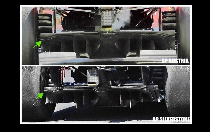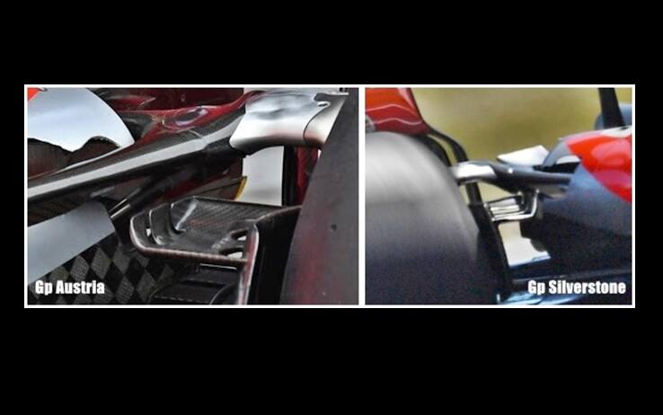Oltre agli interventi sopra elencati la Rossa ha portato in pista anche alcune modifiche di dettaglio come la modifica alle appendici aerodinamiche posizionate nella parte interna degli pneumatici posteriori che sono importanti per condizionare il flusso in arrivo sull'attacco della sospensione e sull'endplate dell'ala posteriore. Come si può ben vedere dall'immagine confronto in alto, sono infatti state completamente aperte le due soffiature.