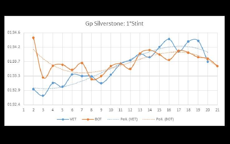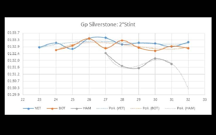 Analizzando il grafico in basso possiamo notare che, a differenza di quanto visto in Austria, Mercedes ha gestito molto bene gli pneumatici con Bottas che, a partire dal giro 15 è stato costantemente più veloce rispetto a Vettel. Bottas non azzardato nessun undercut in quanto il distacco di Vettel non lo permetteva e quindi, in Mercedes, hanno deciso di continuare finché non si fosse fermata la Rossa.