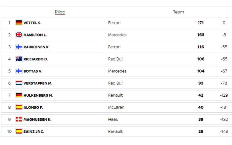Arriva con il sorpasso di Vettel a meno di 30 chilometri dalla fine quando, con una manovra da brivido, scavalca Bottas alla staccata della Brooksland sfruttando le gomme più fresche. La vittoria a questo punto è cosa fatta. "Grazie ragazzi, grazie. Qui a casa loro", ha commentato l'euforico pilota tedesco al traguardo. Quinta la Red Bull di Ricciardo, sesto Hulkenberg (Renault), settimo Ocon (Force India) e ottavo Alonso. Hamilton è riuscito a contenere i danni in una gara partita malissimo e chiusa con il secondo posto dopo una notevole rimonta. Per la rivincita le Mercedes dovranno aspettare un altro appuntamento 'casalingo', il 22 luglio a Hockenheim per il GP di Germania. Ma quella sarà anche la gara di Vettel davanti al suo pubblico. E Seb sa di poter contare su un Raikkonen ancora a podio e apparso ancora in grande forma.
