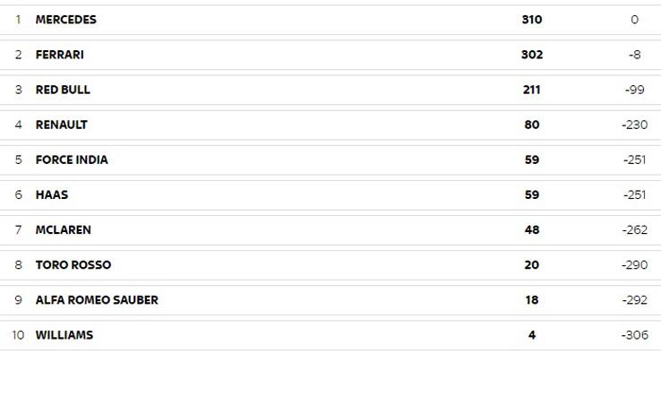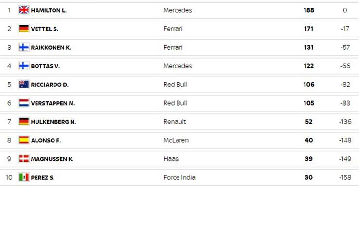Mentre Hamilton scala posizioni e inizia a pensare al podio, la Ferrari reagisce piazzandogli subito davanti Raikkonen, che rientra per la prima sosta già al 15esimo giro, tornando in pista davanti al campione in carica; Vettel effettua il pit stop al 25esimo giro puntando ad arrivare fino in fondo. Le gerarchie a metà gara vedono Raikkonen al comando davanti a Vettel ed Hamilton terzo davanti a Bottas, ma la partita a scacchi è appena iniziata. L'inglese allunga ancora il primo stint nella speranza di poter approfittare della pioggia per effettuare la sosta, mentre davanti Vettel scalpita per mettere la freccia su Raikkonen e al 39esimo giro, dopo un siparietto via radio con il box della Ferrari, viene accontentato dal finlandese