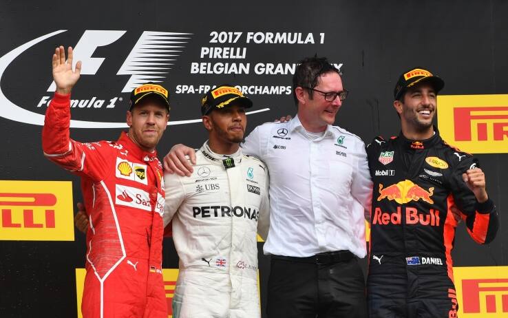Duello serrato tra Hamilton e Vettel per tutti e 44 i giri del GP del Belgio: il distacco tra i due non è mai superiore ad un paio di secondi e Vettel ha anche a disposizione un vantaggio tattico clamoroso: dopo un contatto tra le due Force India, e l’ingresso della safety car, si ritrova con la mescola più morbida (UltraSoft) contro la mescola media (Soft) di Hamilton. Non è sufficiente: Vettel tenta l’attacco sul rettilineo del Kemmel subito dopo il restart, ma Hamilton resiste ed in seguito aumenta il vantaggio, portandosi fuori dalla portata del ferrarista.
