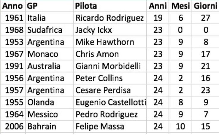Quella dei giovani piloti in Ferrari è una lista che, con Leclerc, racchiude 11 piloti. Nel 1961, a 19, anni, fu Ricardo Rodriguez de la Vega il primo giovanissimo in Rosso. Leclerc, che come detto compirà 21 anni ad ottobre, sarà il secondo driver più giovane di sempre a Maranello.