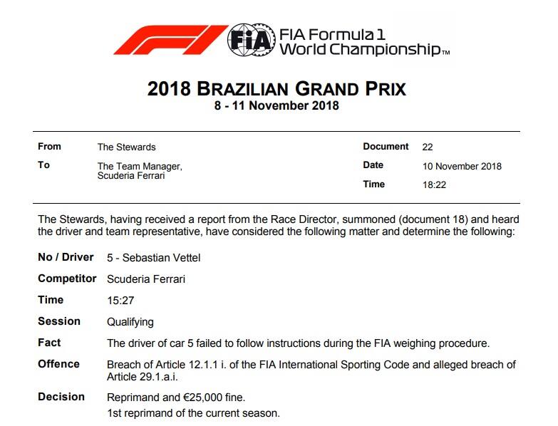 Di seguito il comunicato FIA sulla reprimenda a Vettel, tempi e cronaca
