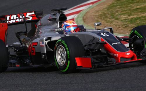 La prima vettura Formula 1 della Haas in pista durante i test di Barcellona nel 2016 -