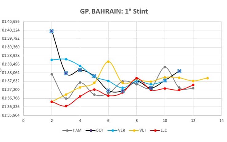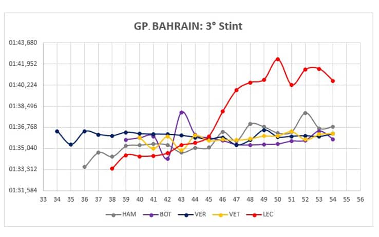 L’effetto domino è stato iniziato da Verstappen che, come dimostra il grafico in basso, era il pilota più in difficoltà (insieme a Bottas) con gli pneumatici soft. Se analizziamo i tempi di Leclerc, Hamilton e Vettel possiamo notare che non si evidenziano grossi innalzamenti dei tempi sul giro a dimostrazione che le gomme erano ancora in perfetta forma. Una volta che il pilota olandese della Red Bull ha “pittato” tutti gli altri piloti sono stati costretti a reagire per evitare un possibile undercut che su questo tracciato a differenza di quanto visto in Australia era un vero e proprio rischio. Proprio sfruttando l’undercut Hamilton è riuscito a scavalcare la Ferrari di Vettel che successivamente ha recuperato la posizione in pista scavalcando la W10 del campione del mondo in carica sul rettifilo principale.