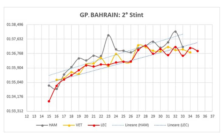 Il giovane pilota della Ferrari stava letteralmente dominando la gara quando, all’improvviso, ha perso potenza dalla sua Power Unit. L’innalzamento dei tempi sul giro si può notare anche dal grafico dove, a partire dal giro 46, si vede un repentino innalzamento dei crono.