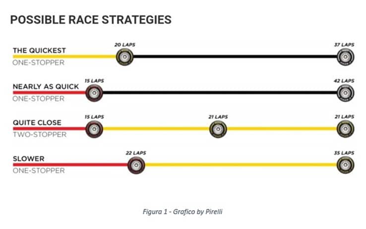 I piloti, come evidenziato dal grafico in basso fornito dalla Pirelli, dovevano effettuare almeno 22 giri per riuscire a completare la gara con un singolo stop. Unica sosta con partenza con pneumatici soft che era anche quella più lenta tra le quattro strategie suggerite dal costruttore di gomme italo-cinese.