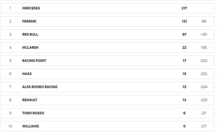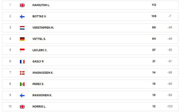 L'unico sussulto arriva al giro 46, quando un contatto tra Norris e Stroll mette fuori causa i due e porta dentro la safety car: alla ripartenza Leclerc deve difendersi da Gasly, Vettel conserva il 4° posto dietro a Verstappen mai a rischio podio e che alla fine sopravanza il tedesco della Ferrari anche nella classifica mondiale ora guidata da Hamilton, con sette punti di vantaggio su Bottas e una enormità su tutti gli altri: Verstappen è a -46, Vettel a -48, Leclerc a -55.