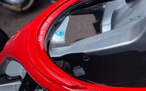 "Niki ci manchi" e la scritta sull'Halo della Mercedes per il GP di Monaco. Un degli omaggi della Mercedes per ricordare Niki Lauda, come il "Grazie Niki" sull'ala anteriore e l'unica stella rossa tra le tante d'argento presenti sulla livrea della W10