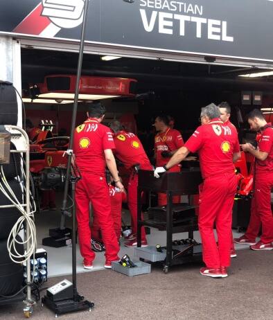 Le immagini dei meccanici al lavoro nel box Ferrari