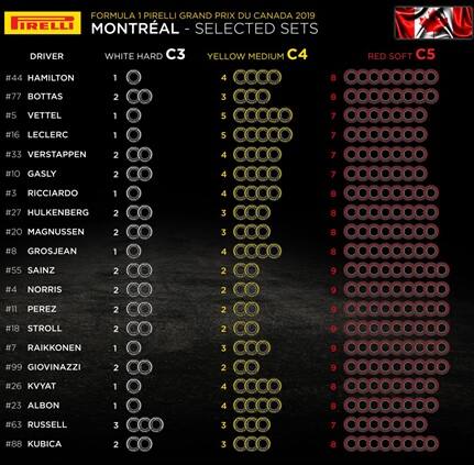 La Pirelli, sul tracciato del Canada, porterà in pista le tre mescole di pneumatici più soffici, in virtù del basso degrado previsto per la tappa nord americana. Il tracciato sollecita le gomme in longitudinale per la trazione e soprattutto per le frenate, innalzando la temperatura e causando degrado. In qualifica sarà importante riuscire a portare nella giusta finestra di funzionamento sia l'assale anteriore che quello posteriore. All'anteriore sarà piuttosto complicato riuscire a scaldare le gomme mentre, al posteriore, avremo l'effetto opposto in quanto tenderanno al surriscaldamento. Le scuderie, come potete osservare dall'immagine in basso, hanno scelto di portare in pista dai 7 ai 9 treni di gomme soft, dalle 2 alle 5 Medie, e 1 o 2 Hard. Differente scelta strategica tra Mercedes e Ferrari in quanto le Frecce d'Argento hanno scelto una Soft in più del Cavallino, che ha preferito un treno in più di Medie; Valtteri Bottas ha poi selezionato un set di gomme dure in più.