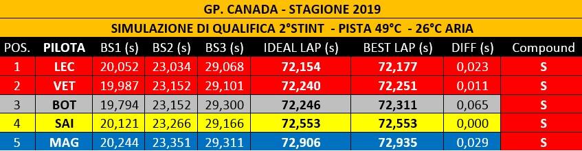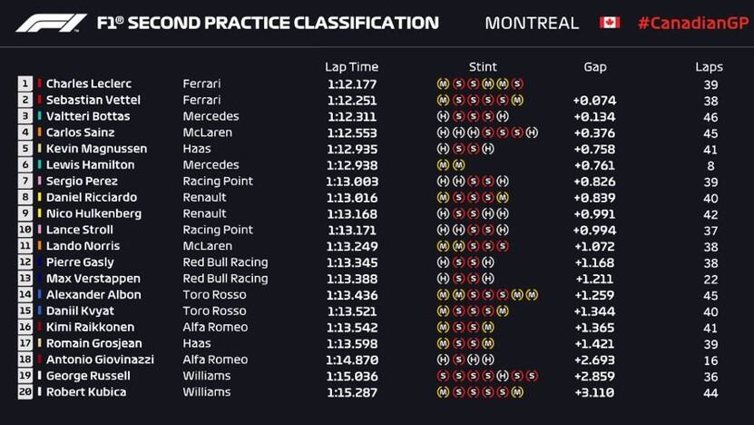 La Ferrari in Canada sembra avere tutte le carte in regola per recitare un ruolo da protagonista anche se, Mercedes, ha dimostrato, soprattutto nella simulazione di gara, di essere molto competitiva. Nella simulazione di qualifica troviamo le due Ferrari davanti a tutti con Leclerc che ha preceduto di un soffio Vettel e Bottas. Nella classifica finale della sessione compisce il quarto posto ottenuto dalla Mclaren di Sainz che è riuscito a precedere la Haas di Magnussen. Hamilton ha ottenuto solo il sesto posto ma a causa di un suo errore non ha sfruttato le gomme soft. Il pilota inglese ha sbattuto con la posteriore destra alla curva 9 e nell’urto ha danneggiato gomma, cerchio, fondo e cambio e nonostante il lavoro degli uomini Mercedes non è più riuscito a tornare in pista. Nella top 10 manca Max Verstappen in quanto anche lui è andato a toccare il muro con la sua Red Bull RB15 che fino a quel momento aveva destato una buona impressione.