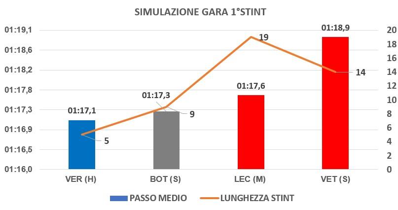 Se ci concentriamo sul passo non abbiamo dati particolarmente interessanti da analizzare in quanto gli stint sono stati di lunghezza diversa e le gomme utilizzate dai piloti sono state diverse. Da segnalare lo stint di Leclerc che con gomme medie è riuscito a girare su tempi molto costanti.
