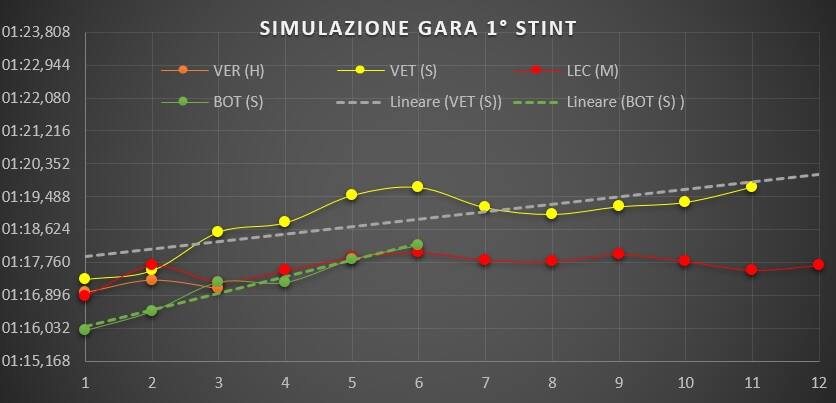 Se ci focalizziamo sulla simulazione di gara possiamo notare che, sia Ferrari che Mercedes, hanno avuto grossi problemi con le gomme soft, come potete osservare dal grafico in basso. Se analizziamo i tempi ottenuti da Bottas e Vettel possiamo notare che la tendenza è quella di un innalzamento dei crono dopo pochissimi giri. Sicuramente questo fenomeno è molto più accentuato sulla Mercedes come potete osservare dalla linea di tendenza del pilota finlandese che ha una pendenza maggiore rispetto a quella del tedesco. Questo ci lascia capire che, se la pista non migliorerà in modo significativo e se le temperature nella giornata di domani saranno in linea con quelle odierne, sarà facile vedere i due top team utilizzare le gomme medie durante il Q2 in modo da poterle sfruttare nella prima parte della gara di domenica.