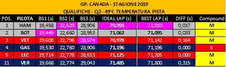 Che il circuito del Canada esaltasse le caratteristiche della SF90 lo si sapeva già dalla vigilia ma il team ha lavorato comunque molto bene per riuscire a mettere Sebastian Vettel in pole position. La SF90 ha costruito il proprio vantaggio nel settore 3 che è caratterizzato da un lunghissimo rettifilo e una chicane di bassa velocità. In questo tratto di pista, come potete osservare dalla tabella in basso, il pilota tedesco è riuscito a guadagnare oltre 2 decimi su Hamilton che nel momento cruciale delle qualifiche è salito di potenza ed è riuscito comunque a limitare i danni visto che, in precedenza, il gap in questo settore era sempre stato maggiore. Hamilton, pur ottenendo i best sector nel primo e nel secondo tratto, non è riuscito a battere Vettel che è riuscito a limitare molto bene i danni sulle curve medio lente che, come sappiamo, sono i punti deboli di questa SF90. Una Ferrari che ha beneficiato al meglio anche delle temperature della pista piuttosto alte che hanno limitato i problemi alle gomme visto che non hanno faticato, come si pensava alla vigilia, a portare in finestra le anteriori. Ritornando ad analizzare le velocità di punta possiamo notare la differenza fatta dalla SF90 nei confronti di Mercedes e Red Bull. Hamilton, addirittura, è stato tra i più lenti sul dritto accusando un gap sul pilota tedesco della Ferrari di ben 8 km/h.