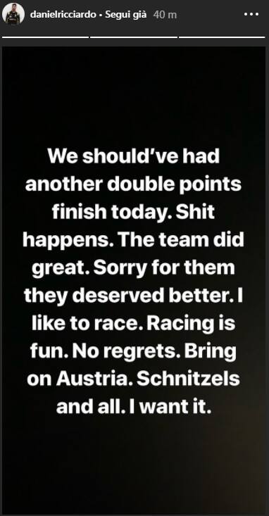 "Se ti accontenti e resti dietro non sei un campione", le prime parole di Ricciardo dopo aver saputo di essere sotto investigazione. In seguito alla decisione dei Commissari il pilota ha risposto sui social, sia su twitter sia su Instagram. "Nessun rimpianto, era giusto provarci. Avremmo dovuto chiudere la gara con il doppio dei punti. Mi spiace per il team".