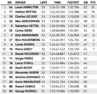 Non è stato solo il duello per il secondo posto tra Bottas e Leclerc, ad accendere il finale del GP di Francia: bagarre anche per la zona punti, protagonisti Norris, Raikkonen e Ricciardo. Quest'ultimo, arrivato settimo al traguardo, è stato beffato nel post gara. I commissari lo hanno infatti penalizzato per un totale di 10 secondi: 5 per essere rientrato in pista in maniera non sicura, costringendo Norris fuori dal tracciato; altri 5 per aver sorpassato Raikkonen in maniera illecita, sfruttando una porzione di asfalto esterno alla pista. Ricciardo è così scivolato dalla settima all'undicesima posizione, e ha perso 3 punti sulla patente: 2 per la manovra su Norris; 1 per quella su Raikkonen. 7° Kimi, alle sue spalle completano la top ten Hulkenberg, Norris e Gasly.