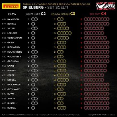 La Pirelli ha deciso di portare per il Gran Premio d'Austria le mescole C2, C3 e C4, escludendo le estremità più hard e più soft della gamma. Se andiamo ad analizzare le scelte fatte dai piloti possiamo notare che esiste una sostanziale differenza tra Ferrari e Mercedes. Le Frecce d’Argento hanno optato per 9 treni di soft, due in più rispetto a Ferrari. Di conseguenza anche la scelta delle medie risulta diversa, con Leclerc che ne avrà 5, a dispetto delle 4 di Vettel, le 3 di Bottas e le 2 di Hamilton. Visto il caldo che è previsto in questo fine settimana in Austria sembra che le decisioni prese da Ferrari vadano per la direzione giusta e questo potrebbe rappresentare un vantaggio per Vettel e Leclerc. Scelte differenti in casa Red Bull, con Pierre Gasly che avrà lo stesso numero di treni di Soft dei piloti Mercedes, mentre Verstappen ne avrà uno in meno. 4 i treni di Medium per l'olandese contro i 3 di Gasly. Entrambi avranno invece un solo set di Hard che, con molta probabilità, verrà utilizzato in gara.