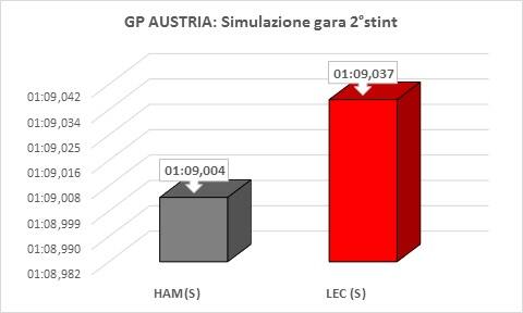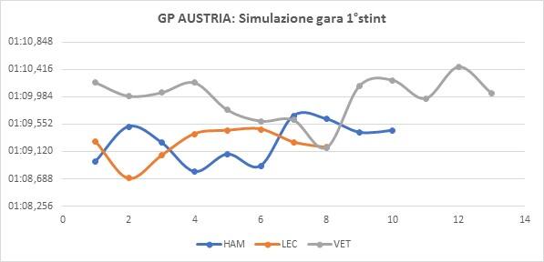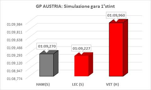 Con i pochissimi dati raccolti nella giornata odierna è molto prematuro dire chi è più veloce tra la W10 e la SF90 in quanto le prestazioni tra le due vetture sono piuttosto similari. La prima incognita che verrà svelata solo durante il Q2 di domani è quella di capire con quale gomma si qualificheranno i top team. Il tracciato è molto corto e non sarà così semplice passare il turno con le medie. Le “rosse” ha creato parecchi problemi sul giro singolo ma nei long run, come potete osservare dal grafico in basso, si sono comportate bene.