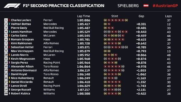 Il pilota finlandese, nonostante il grosso errore compiuto, è riuscito comunque ad ottenere la seconda prestazione con un “laptime” ottenuto con le gomme medie a dimostrazione della competitività della sua W10. Il fine settimana austriaco per Bottas non è iniziato proprio nel migliore dei modi visto che anche le FP1 sono state piuttosto travagliate visto che ha dovuto sostituire la Power Unit evoluzione ritornando alla specifica vecchia a causa di una perdita di olio. Sarà interessante capire se i meccanici anglo-tedeschi riusciranno a risolvere questo problema prima delle FP3 in modo da dare a Bottas una Power Unit con un chilometraggio molto minore rispetto alla versione 1. Sempre restando in tema Mercedes, Hamilton ha abortito il suo giro con gomme “rosse” e per questo lo ritroviamo solo al quarto posto grazie ad un ottimo tempo ottenuto con pneumatici Hard. Red Bull anche in questo fine settimana sembra destinata al ruolo di terza forza. Con Verstappen fuori c’è da segnalare la buona prestazione di Gasly che è riuscito a portare la sua RB15 al terzo posto. Dopo l’ottimo fine settimana francese si conferma in ottima forma la Mclaren con Sainz che ha ottenuto il quinto tempo ed è stato autore di un ottimo long run.