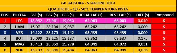 Leclerc riporta la Ferrari in pole position sul tracciato del Red Bull Ring dominando le qualifiche fin dal Q1. La SF90, su questo tracciato, sembra avere maggiore velocità della Mercedes e solo un problema tecnico alla Power Unit di Vettel ha privato alla scuderia di Maranello una possibile prima fila tutta rossa. Lewis Hamilton è riuscito a portare la sua Mercedes W10 in seconda posizione ma non ha mai dato l’impressione di avere la velocità per impensierire le due Ferrari. Il cinque volte campione del mondo partirà dalla quarta posizione data la penalità, dopo aver ostacolato Raikkonen. Il britannico ha chiuso le qualifiche al secondo posto ma questo gesto gli è costato tre posizioni in griglia. Ottimo il terzo posto di Verstappen che dopo l’errore di ieri che gli è costato buona parte delle FP2 è riuscito a portare la RB15 in seconda fila davanti all’altra Mercedes di Bottas. Tra le sorprese di giornata bisogna segnalare la quinta posizione di Magnussen con la Haas. Questo dimostra l’ottimo lavoro fatto dai motoristi Ferrari che sono riusciti a portare ben 5 vetture nella top 10. Positiva anche questa settimana le prestazioni di Norris con la sua McLaren che domani avrà una ghiotta occasione per allungare sulla Renault nella classifica costruttori. Da segnalare anche la prova di Raikkonen e Giovinazzi che hanno qualificato le loro Alfa Romeo rispettivamente in settima e ottava posizione.
