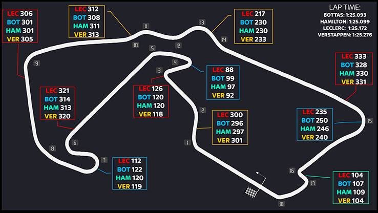 Il risultato delle qualifiche infatti ci mostra un Lewis Hamilton che era favoritissimo ma non riesce a centrare la Pole position di soli 6 millesimi, un Leclerc con una Ferrari che si aspettava di essere spacciata e invece ha mancato la pole di un soffio (ricordiamo che prima delle ultime 4 curve il monegasco era in vantaggio sulla concorrenza tedesca) e un Max Verstappen quarto con la RedBull che pensava di non avere armi per combattere ma invece si ritrova lì nella mischia. Siamo andati quindi ad analizzare nei vari punti chiave della pista i riscontri velocistici dei primi 4 per capire dove ciascun pilota ha fatto la differenza.