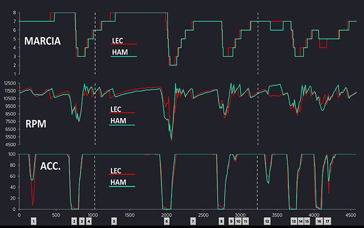 La prima differenza che si nota è come le cambiate di Lewis Hamilton avvengano “dopo” rispetto a quelle di Charles Leclerc. I motivi possono essere molti. La spiegazione più banale è quella di una scelta di rapporti del cambio diversa tra i due team, ma anche altri fattori possono spiegare questa differenza. Ad esempio in uscita dalle curve più lente Leclerc anticipa in maniera significativa le cambiate, sembrando quasi effettuare degli “short shift”, tenendo i giri del motore più bassi per evitare eventuali problemi di pattinamento del posteriore in trazione. La tecnica è apparsa comunque molto efficace con una Ferrari che guadagnava molto negli allunghi come di consueto. L’altra differenza degna di nota è a curva 12, con Hamilton che scala in sesta marcia per affrontare la curva mentre Leclerc si limita ad alzare il piede dall’acceleratore rimanendo in settima marcia.