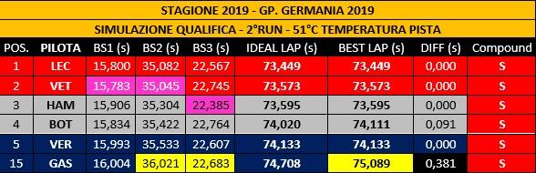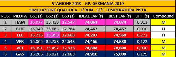 Nell’inferno di Hockenheim brilla la Ferrari SF90 che sembra adattarsi molto bene alle alte temperature della pista (sono stati raggiunti 51°C) che ci sono state durante le prove libere 2. Temperature che, nei prossimi giorni, causa maltempo, dovrebbero abbassarsi notevolmente ed è per questo che i dati emersi da queste FP2 potrebbero non trovare corrispondenza con quanto vedremo domani in qualifica e domenica durante la gara. Ferrari è andata sicuramente bene sia nelle FP1 che nelle FP2 cogliendo in entrambe le sessioni i migliori riscontri cronometrici. Mercedes, invece, ha sofferto maggiormente il caldo rispetto al team italiano ma i dati che emergono dalla simulazione gara dimostrano quanto sia temibile la W10 anche in condizioni ambientali che non si sposano alla perfezione con il progetto anglo-tedesco. Leggermente in ombra la Red Bull che ha raccolto soltanto il quinto tempo con Verstappen e il quindicesimo con Gasly che non è riuscito a sfruttare al meglio le gomme soft. Il pilota francese ha ottenuto il suo “best time” con le gomme medie e, durante la simulazione gara, è stato autore di un incidente all’ultima curva che ha costretto il direttore di gara ad esporre la bandiera rossa. Il pilota olandese, intervistato al termine delle prove libere, non è parso molto preoccupato dimostrando di avere la convinzione che, domani, e domenica la RB15 avrà il potenziale per lottare con Mercedes e Ferrari: “Ancora non abbiamo trovato il bilanciamento perfetto, ma neppure abbiamo potuto fare un tentativo pulito per problemi vari, tra cui uno al motore, quindi siamo più vicini di quanto sembri”