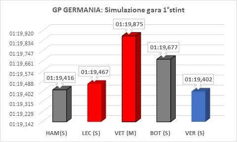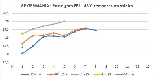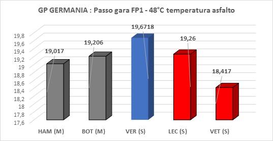 Osservando le medie possiamo notare che, il cinque volte campione del mondo, ha inflitto 2 decimi a Leclerc (usava le hard) e 3 a Bottas. Più staccato Vettel che con le soft è quello che ha sofferto maggiormente.
