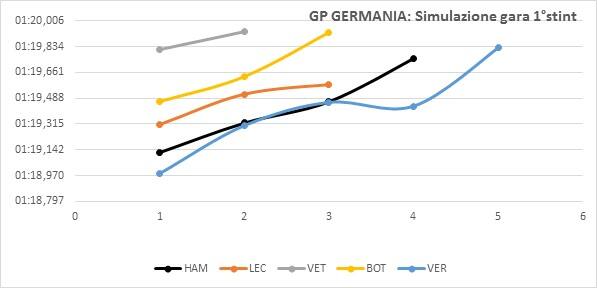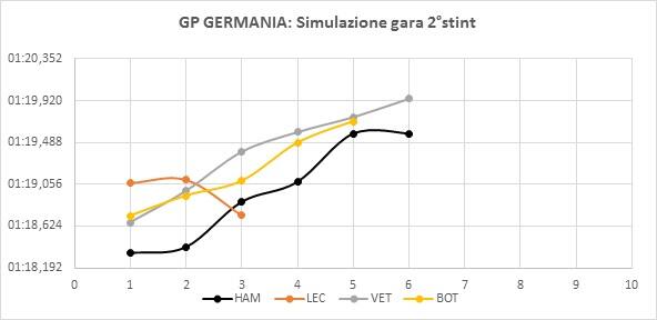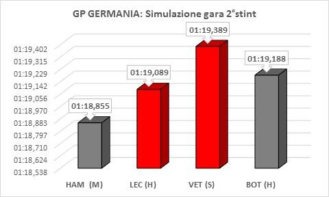 Nella seconda parte di simulazione, effettuata con i compound più duri, Mercedes è stata la più veloce con Hamilton. Hamilton, oltre ad essere stato il pilota con il miglior ritmo è stato quello che ha avuto il miglior “time attack” girando in 1:18,3. Anche con questi compound si nota chiaramente il degrado delle gomme visto che i tempi, giro dopo giri, continuano ad alzarsi.