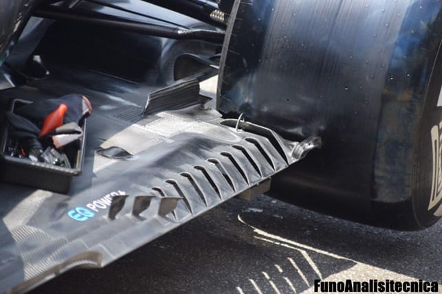 Si è intervenuti nella zona del fondo dove sono state ritoccate le tante soffiature che, ormai, tutti i team utilizzano nella parte centrale e terminale del fondo per cercare di ridurre il più possibile il fenomeno del “tyre squirt” ossia eliminare quelle turbolenze che si vengono a creare, a causa del rotolamento degli pneumatici, in una zona molto importante di una vettura di Formula 1. Riuscire a ridurre queste turbolenze molto nocive ti garantisce un’efficienza maggiore grazie al buon funzionamento dell’estrattore.