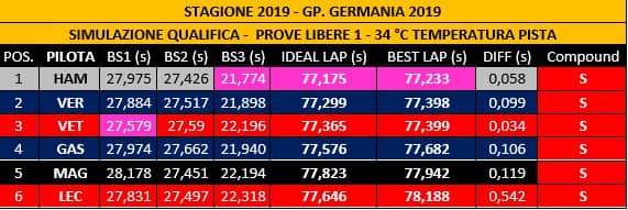 Per quanto riguarda la simulazione di gara i dati da analizzare sono veramente pochi. Solo Hamilton, in FP1, ha effettuato un long run con gomme medie. Qualche giro lo ha fatto anche Gasly con soft e Vettel che, sfruttando le “rosse” ha messo a segno un solo giro cronometrato ottenendo il miglior tempo d’attacco.