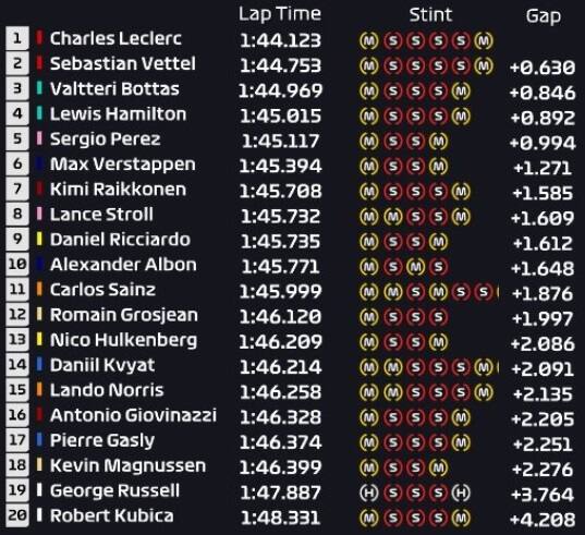 In Belgio Ferrari in cima alla classifica dei tempi: nel primo turno il più veloce è Vettel davanti a Leclerc, che lo scavalca nella seconda sessione. Da rivedere però l'usura delle gomme, Mercedes superiori nel passo gara. Hamilton chiude 4° alle spalle di Bottas: per il leader del Mondiale problemi al pedale dell'acceleratore nelle FP1 e al casco nelle FP2