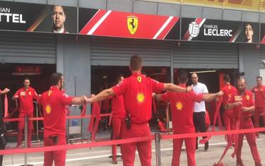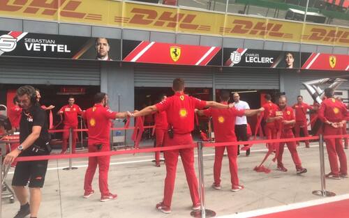 I tecnici della F1 impegnati nella fase di riscaldamento davanti al box a Monza, mentre i piloti sono impegnati in conferenza -