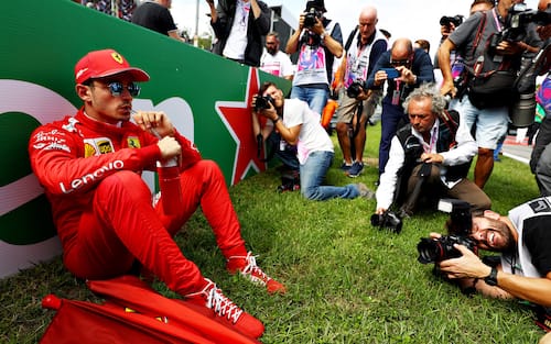Tutta la concentrazione di Charles prima della gara: il pilota della Ferrari è letteralmente preso d’assalto dai fotografi