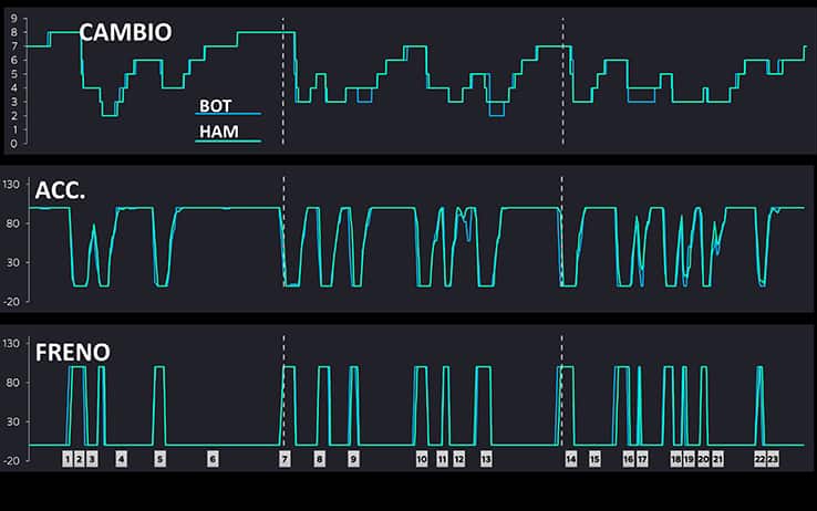 L’altra differenza macroscopica è nel punto più tortuoso della pista, che va da curva 10 a curva 13, dove Hamilton alza pochissimo il piede al confronto del compagno e riesce ad affrontare curva 13 (che è quasi un tornante) addirittura in terza marcia, mentre Bottas deve scalare in seconda.