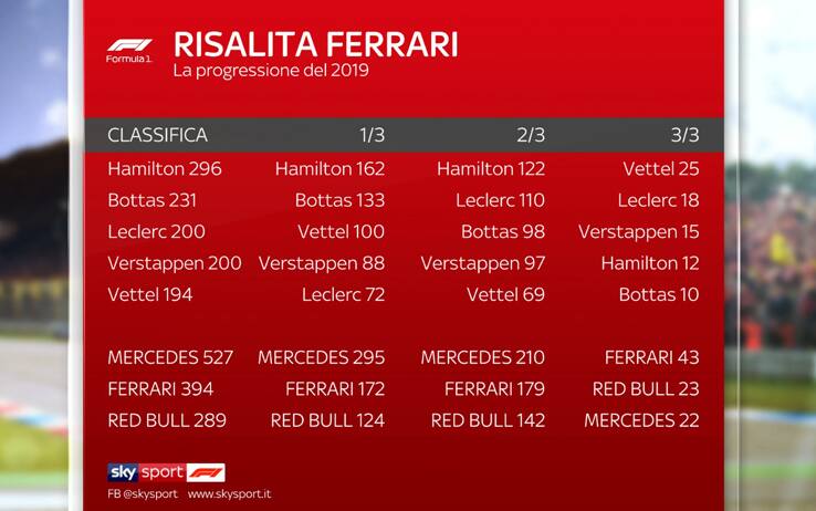 Dividendo il calendario dei 21 GP di Formula 1 in 3 parti, si nota la risalita della Ferrari, dopo un avvio di stagione tutto targato Mercedes. E se la classifica costruttori è ormai chiusa, Leclerc punta al secondo posto di Bottas