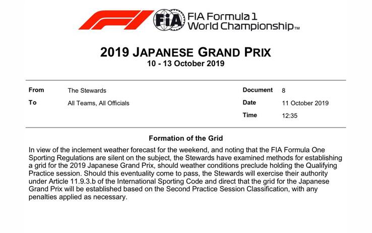 Alla luce di quesa decisione, team e piloti hanno avuto a disposizione solo le due sessioni di prove libere di venerdì per preparare le qualifiche di domenica mattina (Libere 3 cancellate del tutto). In due precedenti occasioni, le qualifiche di F1 in Giappone sono state spostate domenica: nel 2004 e nel 2010.