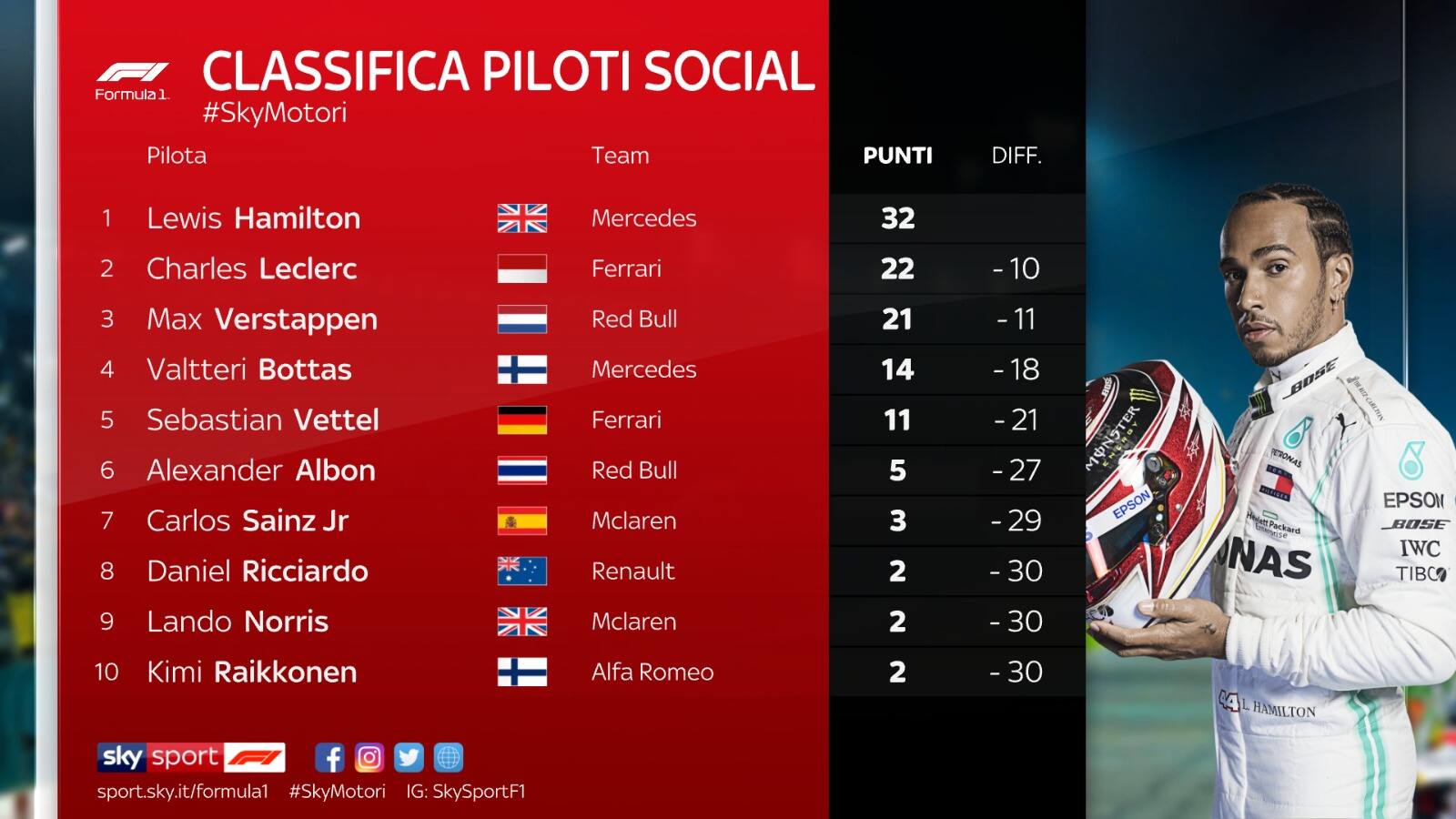 Il titolo di pilota social non poteva che andare a lui, Lewis Hamilton. Troppo evidente lo strapotere mostrato in più di un'occasione dal 6 volte campione del mondo, vincitore di 10 gare (su 20) in stagione e sempre a punti in questo 2019. Un percorso ai limiti della perfezione per 'The Hammer', che si prende anche il "Mondiale social" del 2019