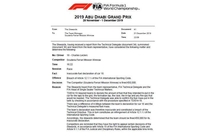 Si chiude con una pesante multa la stagione 2019 della Ferrari, che dovrà pagare 50mila euro a seguito di un'investigazione scattata prima della gara di Abu Dhabi. I commissari FIA, attorno alle 19 italiane, hanno ufficializzato la decisione sulla monoposto numero 16 di Charles Leclerc: la benzina dichiarata dal team sulla monoposto del monegasco non era risultata conforme nei controlli pre gara (quantità diversa da quella comunicata alla Federazione). Data l'infrazione alla direttiva TD 014-19, la Ferrari è stata sentita dai commissari dopo la gara e si è arrivati alla sanzione pecunaria che non comporta cambiamenti sull'ordine d'arrivo: Lelcerc conserva il terzo posto.