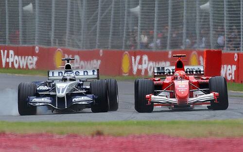 IL DUELLO - Alla curva Whiteford il pilota Williams affianca la Ferrari nel tentativo di superarlo, ma Schumi lo chiude costringendolo ad andare sull'erba: entrambi si ritirano.