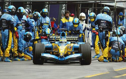 PIT STOP - Fisichella resta al comando del GP fino al primo pit stop, quando in testa va Barrichello seguito dalla Renault di Alonso. I due si fermano allo stesso giro consentendo a Fisichella di rimettersi in testa.