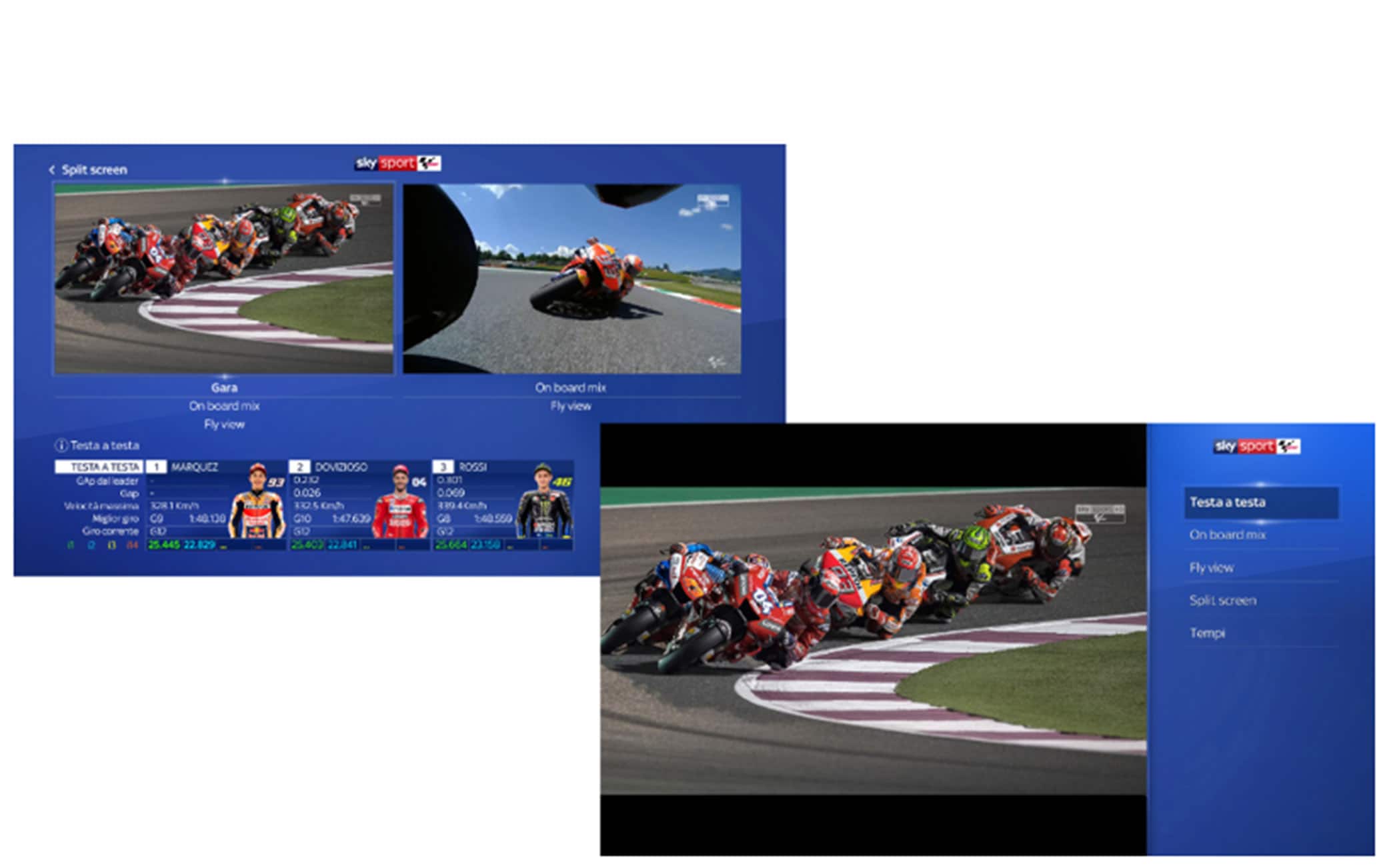 Per la MotoGP ci sarà la possibilità di accedere all’On Board Mix (per vivere ogni giro dal punto di vista del pilota) durante le qualifiche della top class, mentre in gara sono disponibili la Fly View (per seguire tutti i giri di pista dall’elicottero), l’On Board Mix, il Testa a Testa (per confrontare le prestazioni di tre piloti a scelta in tempo reale), i Tempi e la novità dello Split Screen su Sky Q.