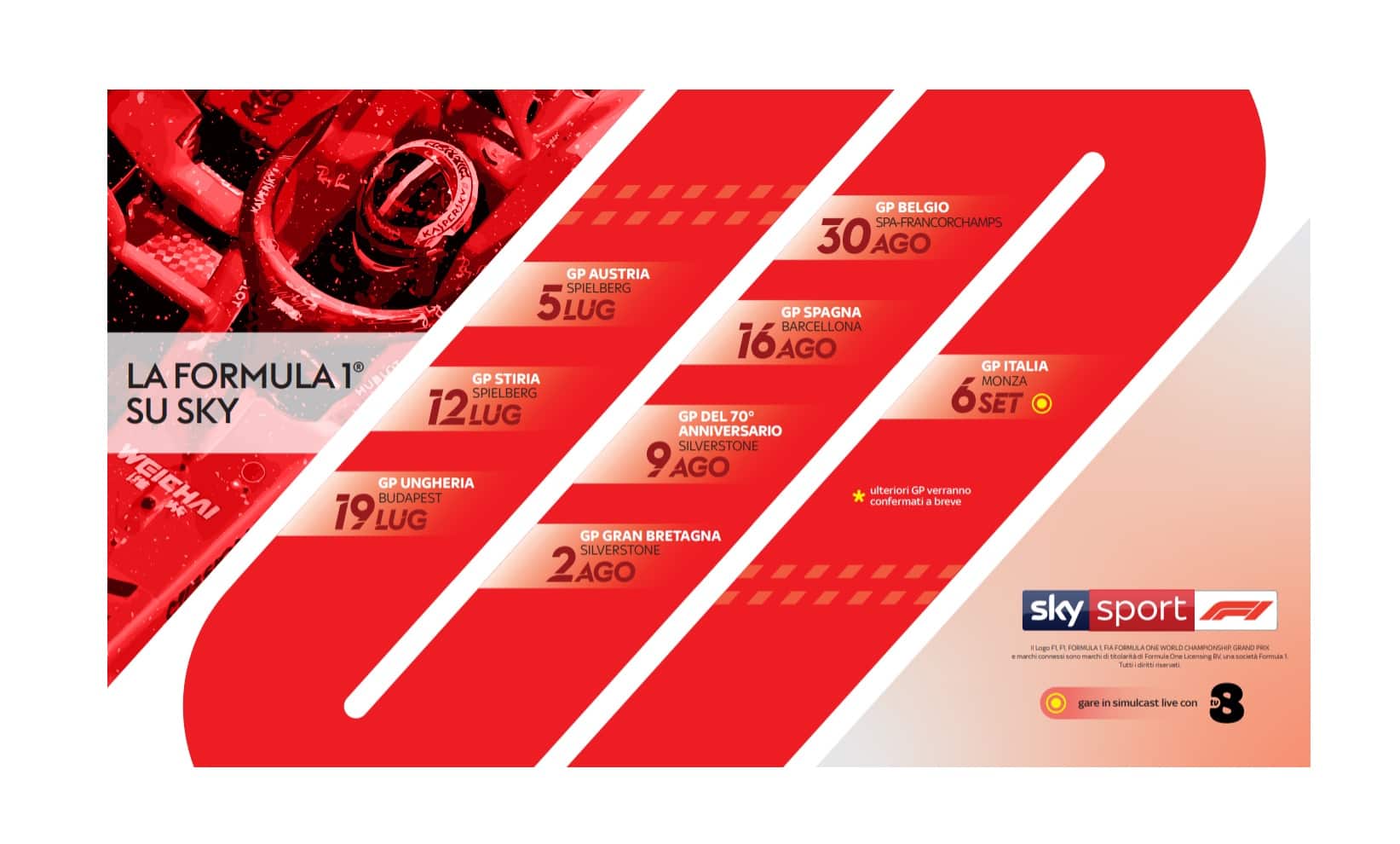 A inizio luglio al via la stagione motori 2020, con più di 1.000 ore live, come sempre oltre 30 in tutto per ogni weekend di corse, e più di 150 gare tra Formula 1, MotoGP, Superbike e i principali campionati a due e quattro ruote in onda sui due canali dedicati Sky Sport F1 e Sky Sport MotoGP. Una successione impressionante di sfide da vivere su Sky Q e visibile anche su Sky Go, ma anche una selezione di gare sul digitale terrestre e su TV8 e tutti gli appuntamenti via fibra e su NOW TV, il servizio in streaming di Sky.