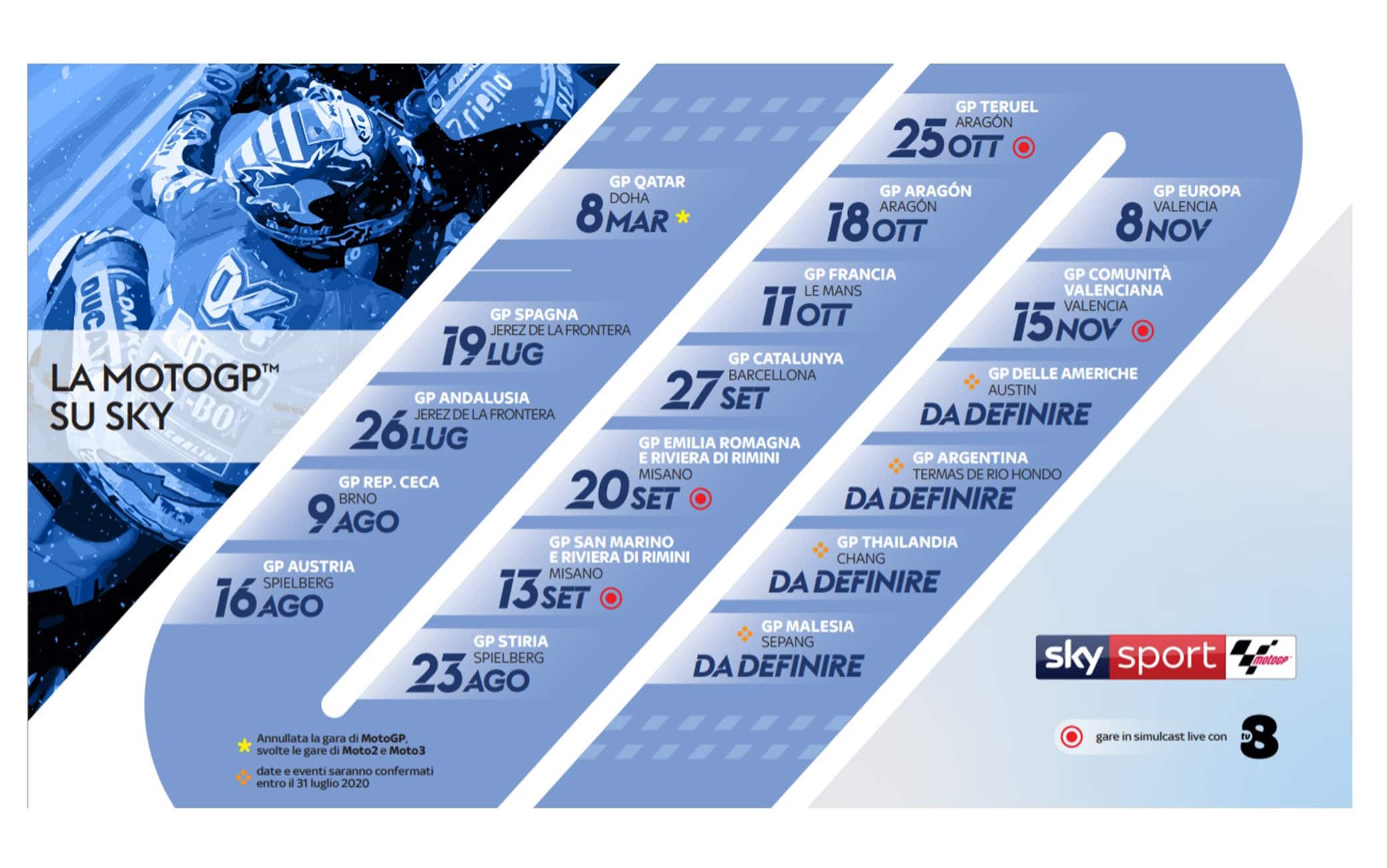 - MotoGP: fino a 17 GP in diretta su Sky Sport MotoGP (al momento, tra quelli confermati: GP di San Marino e della Riviera di Rimini, GP dell’Emilia Romagna e della Riviera di Rimini, GP di Teruel e GP della Comunità Valenciana in diretta anche su TV8)