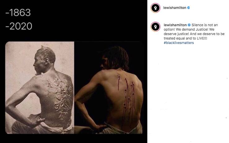Il pilota britannico, che da tempo porta avanti la causa di “Black Lives Matter”, ha poi pubblicato un post molto significativo in serata sul suo profilo Instagram. "Il silenzio non è un'opzione! Chiediamo giustizia! Ci meritiamo giustizia! E meritiamo di essere trattati alla pari e di Vivere!", ha scritto l'inglese con l'hashtag #blacklives matters e una foto eloquente sulla problematica del razzismo. L'immagine risale al 1863 e ritrae Gordon (conosciuto anche come "Peter il fustigato"), uno schiavo sottoposto a flagellazione in Louisiana, che di spalle mostra le cicatrici sulla schiena. Accanto un'immagine a colori di oggi, con un altro uomo di colore ferito. Chiaro il riferimento a Blake, colpito alle spalle dalla polizia da 7 colpi di proiettile. E chiaro anche il significato del post di Hamilton: dopo 157 anni lo schiavismo non esiste più, ma non si è ancora riusciti a debellare la piaga del razzismo.