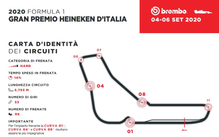 Autodromo di Monza, il "Tempio della velocità". La Formula 1 è Italia per l'ottava prova del Mondiale 2020, prima delle due consecutive nel nostro Paese (poi ci sarà il Mugello). Per certi versi si tratta di un circuito molto simile a quello del Belgio, precedente tappa di questo campionato. Monza è un tracciato molto impegnativo che mette a dura prova l'impianto frenante delle monoposto. La presenza di lunghi rettilinei e la mancanza di carico aerodinamico, che riduce la possibilità di scaricare efficacemente la coppia frenante a terra, determinano staccate violentissime e impegnative da gestire. Di seguito i dati forniti dalla Brembo.