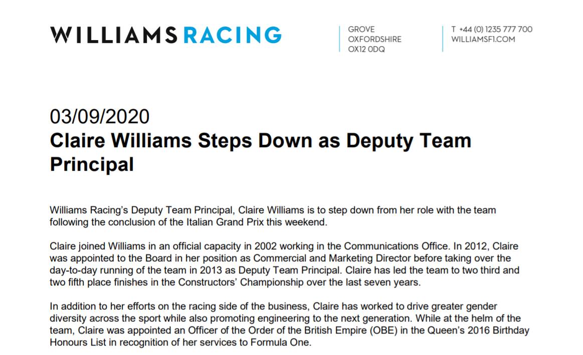 Claire Williams non sarà più il team principal della Williams dopo il GP di Monza. Il team lo ha annunciato attraverso una nota ufficiale. L'avvento della nuova proprietà porta con sé un ulteriore passo indietro della famiglia Williams e della figlia del fondatore della scuderia, Sir Frank. La scuderia inglese ha già ufficializzato la vendita al gruppo Dorilton.